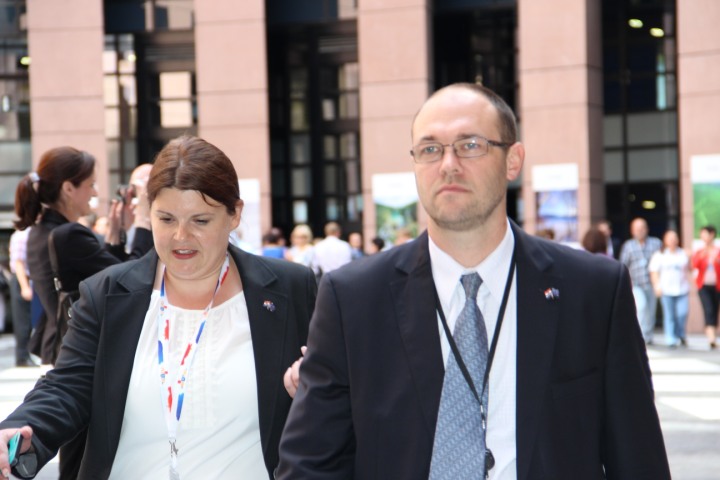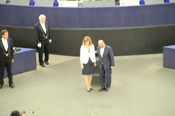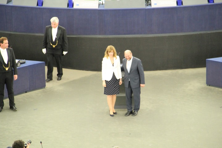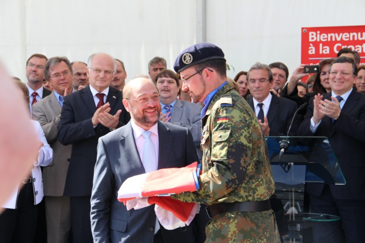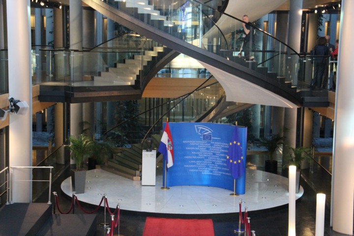 Strasbourg - Predsjednik parlamenta Martin Schulz je osobno zaželio dobrodošlicu svakom hrvatskom članu u centralnom dijelu plenarne dvorane ispred predsjedavajućeg stola. Nakon toga je na postolju s ostalim zastavama članica EU svoje mjesto našla hrvatska zastava u 17:25 sati.