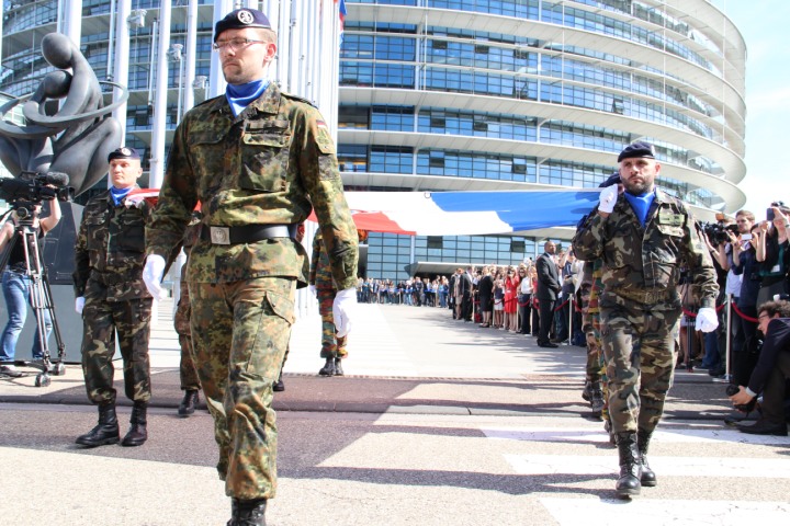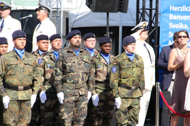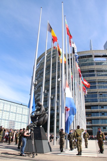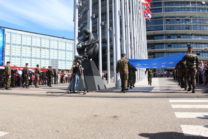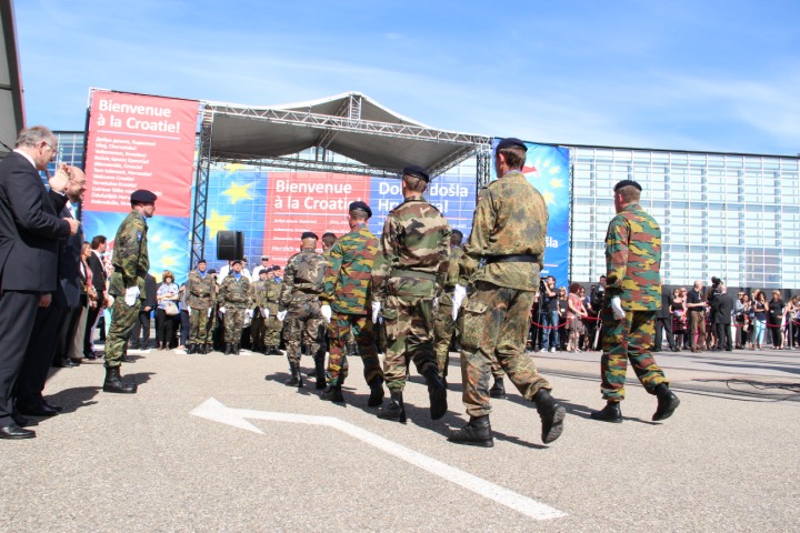 Strasbourg - Svečanost ceremonijalnog podizanja zastava RH i EU ispred Europskog parlamenta uz nastup klape HRM Sv Juraj koji su tom prigodom izveli hrvatsku i europsku himnu. Tom prigodom nazočnima su se obratili predsjednik Europskog parlamenta Martin Schulz i predsjednik Hrvatskog sabora Josip Leko.